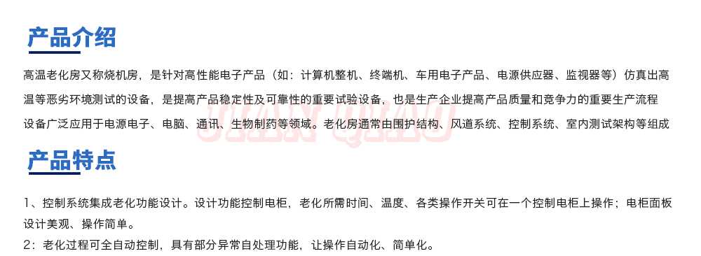 產(chǎn)品型號(hào):JQHTA-12(非標(biāo)定制) 品牌:劍 喬 用途:高溫老化房又稱燒機(jī)房,是針對(duì)高性能電子產(chǎn)品(如:計(jì)算機(jī)整機(jī)、終端機(jī)、車用電子產(chǎn)品、電源供應(yīng)器、監(jiān)視器等)仿真出高溫等惡劣環(huán)境測(cè)試的設(shè)備,是提高產(chǎn)品穩(wěn)定性及可靠性的咨詢熱線:13829135130
